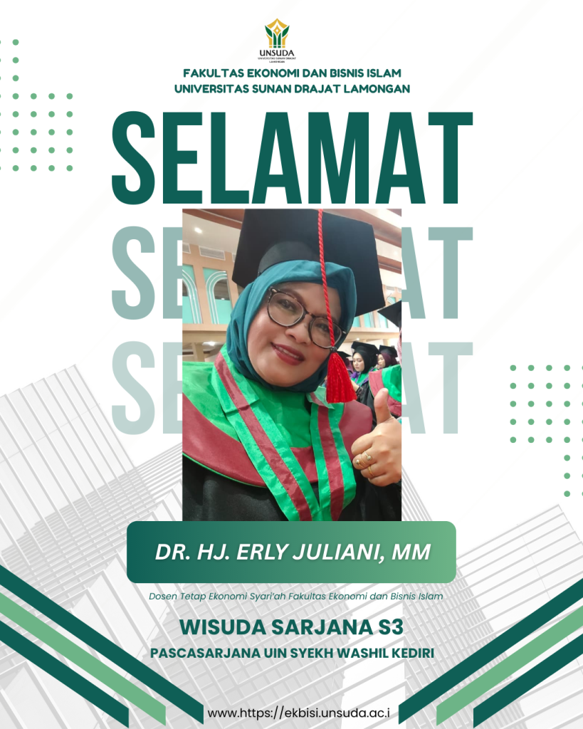 Fakultas Ekonomi dan Bisnis Islam (EKBISI) Universitas Sunan Drajat Lamongan menyampaikan apresiasi dan ucapan selamat kepada Dr. Hj. Erly Juliani, MM, Dosen Tetap Program Studi Ekonomi Syari’ah, yang telah resmi menyelesaikan studi pada Program Doktor (S3) Pascasarjana UIN Syeikh Wasil Kediri.
