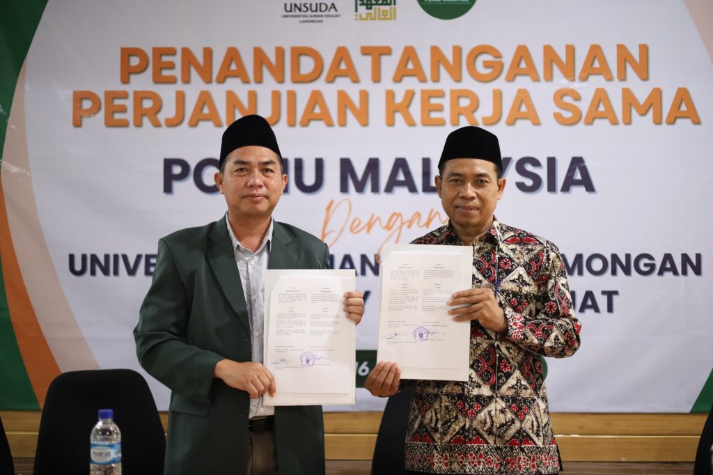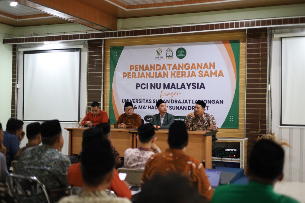 Lamongan – Universitas Sunan Drajat (UNSUDA) Lamongan resmi menjalin kerja sama internasional dengan Pengurus Cabang Istimewa Nahdlatul Ulama (PCI NU) Malaysia serta Ma’had Aly Sunan Drajat melalui penandatanganan Perjanjian Kerja Sama (PKS). Kegiatan ini menjadi langkah strategis dalam memperkuat jejaring internasional perguruan tinggi berbasis pesantren, khususnya dalam bidang pendidikan, penelitian, dan pengabdian kepada masyarakat (PkM).